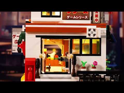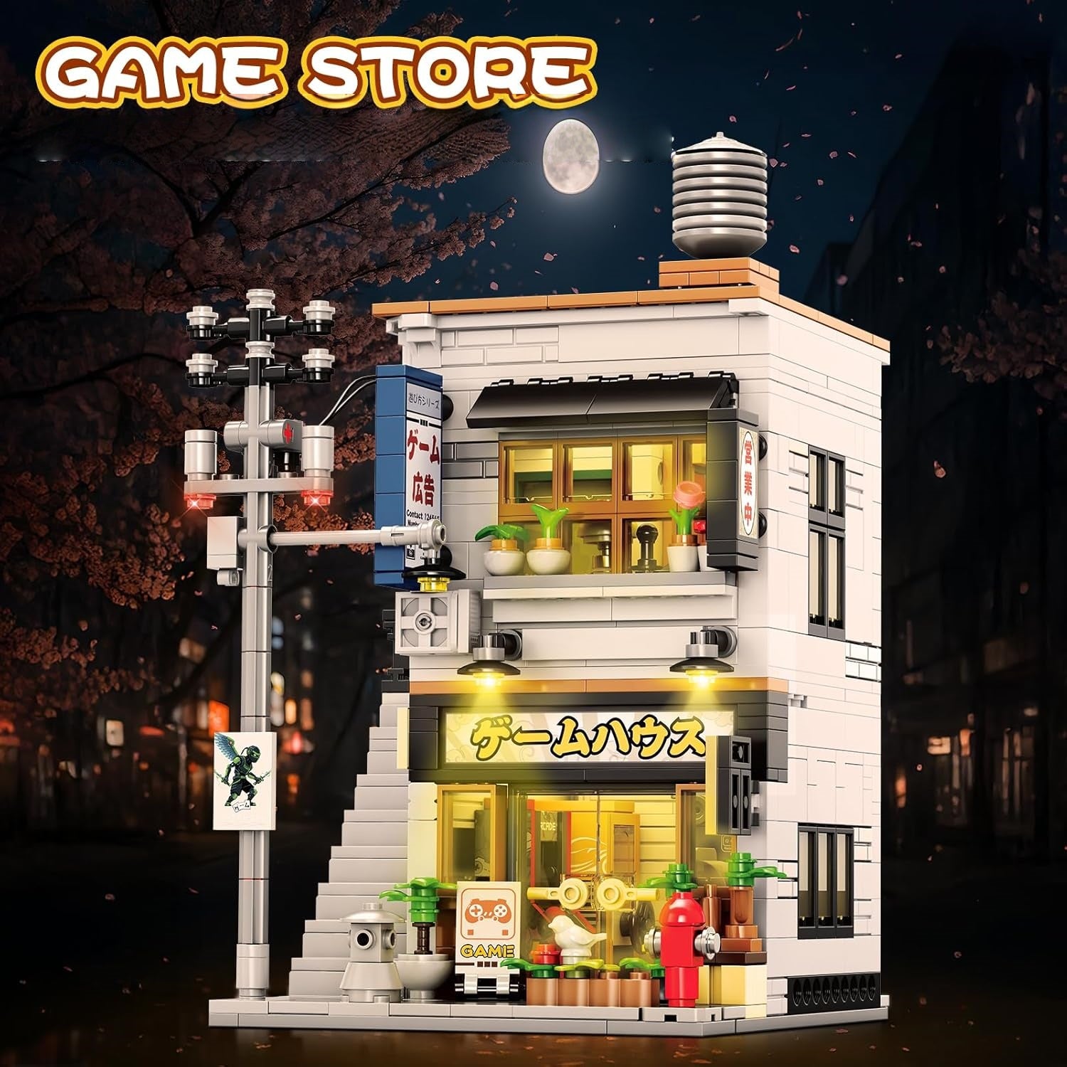 - 【Glowing Game Store】This Japanese mall store building set combines video game elements with Japanese decorative aesthetics, cleverly blending video game culture and providing a warm atmosphere when illuminated. After assembly, it can be used as a unique desktop decoration, adding a stylish video game atmosphere to the room.