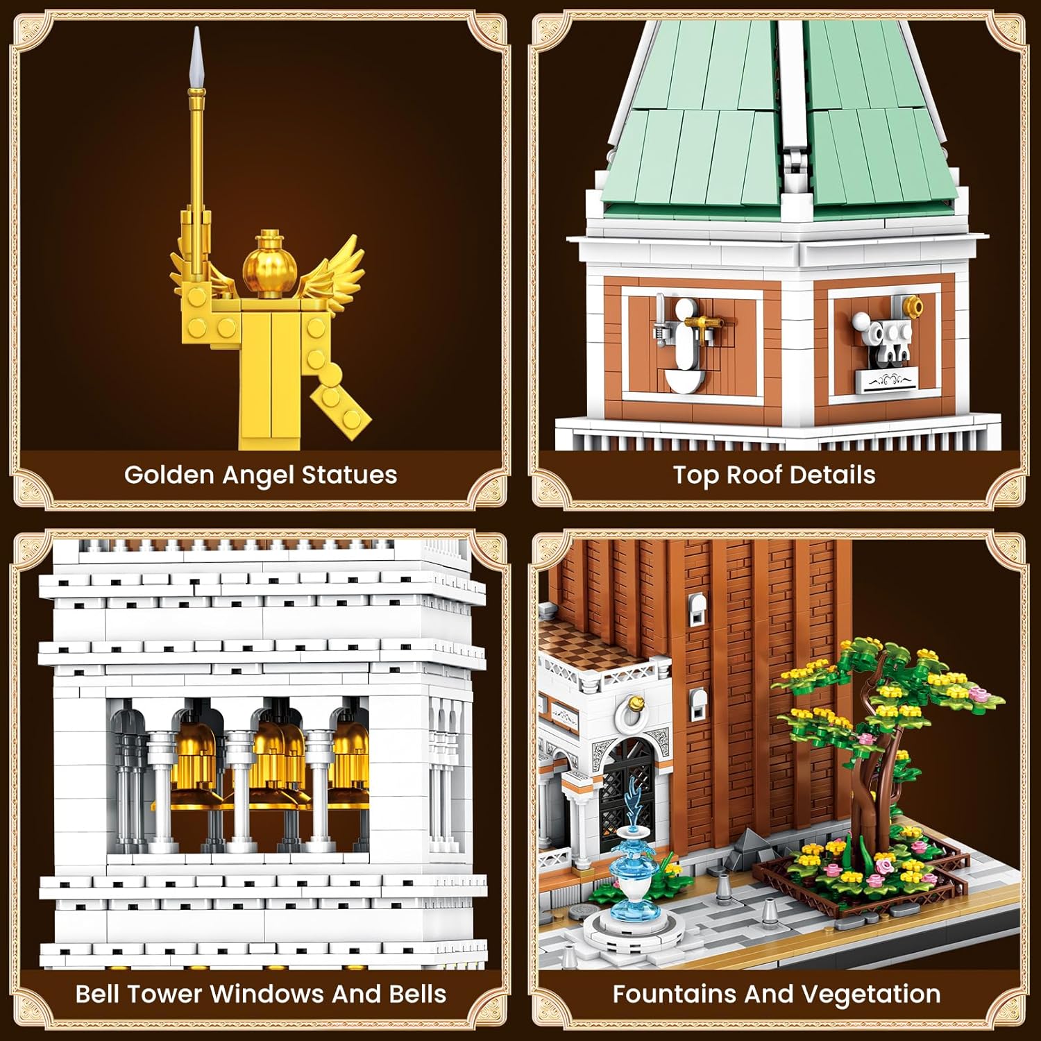 - AUTHENTIC DETAILS – From the elegant arches and clock face to the red-brick tower body and golden angel statue on top, every element of the bell tower building kit is faithfully captured in this modular buildings